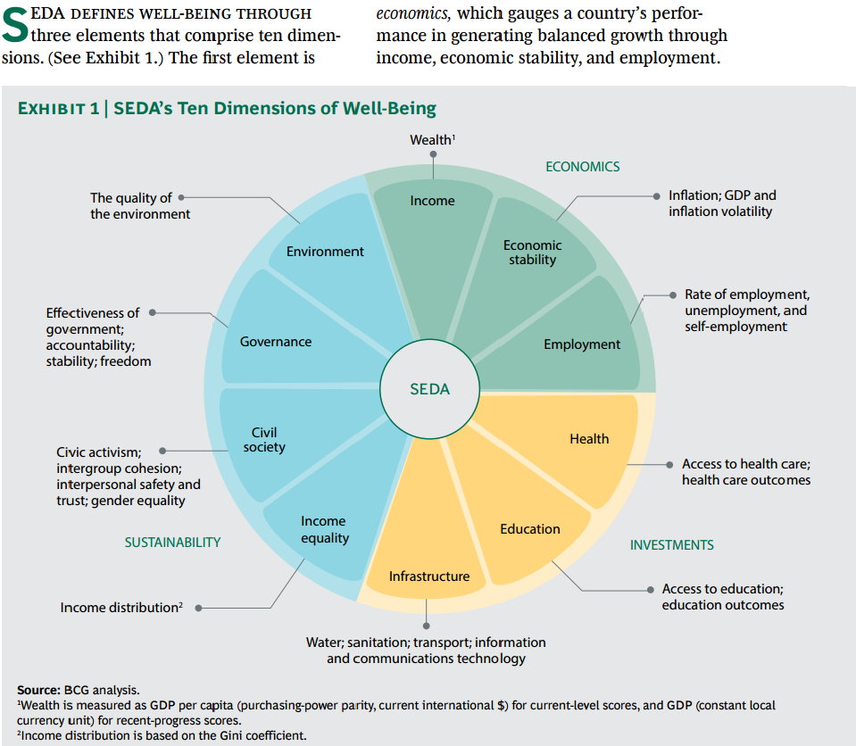 Оценката за устойчиво икономическо развитие на Бостънската консултантска група определя благосъстоянието въз основа на икономиката, инвестициите и устойчивостта.