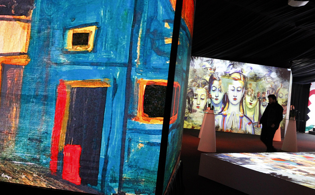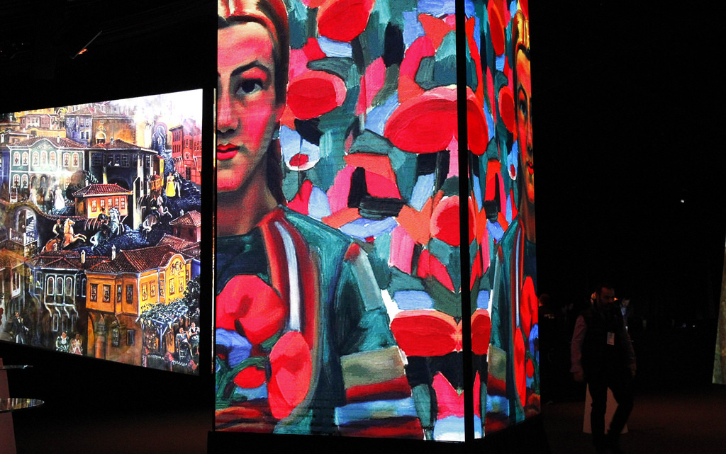 The multimedia show is displayed on screens varying in size and shape. The paintings and pictures depict eight different aspects of the country, completing the sentence “Bulgaria is….”